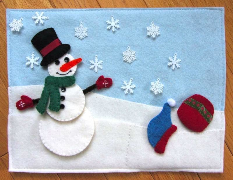 - Почти готовую елку помещаем в руках снеговика и пришиваем.