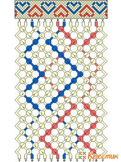 Для урока я возьму такую схему в 12 ниток. На каждый из трёх цветов нужно по 4 нитки длиной 80см. Чтобы не возникало путаницы, сразу скажу, что вместо белого цвета у нас бежевый, вместо розового — красный, а вместо чёрного — синий.