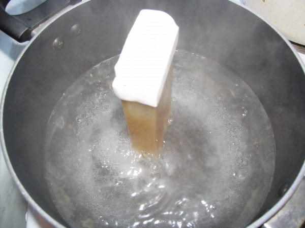 - После закипания воды измерьте ее температуру термометром, он должен показывать не более 55 — 80 °С. При более высоких температурах парафин начнет испаряться.