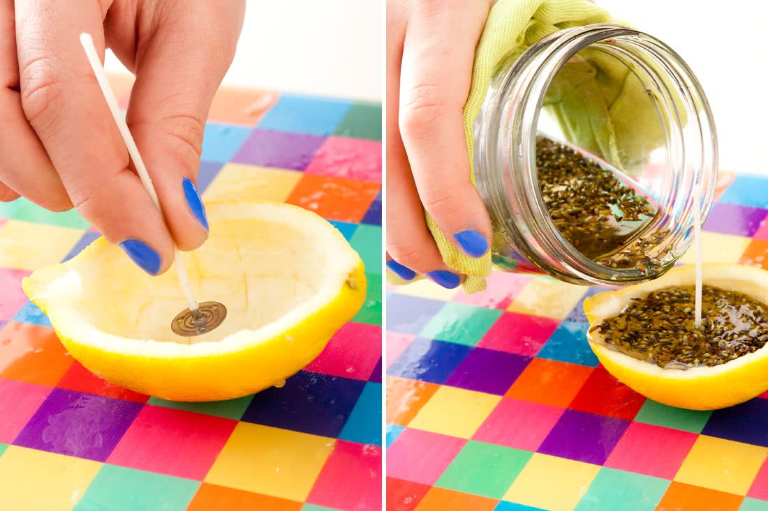 В центре лимонной половинки закрепите фитиль. Залейте фруктовый подсвечник расплавленным воском.