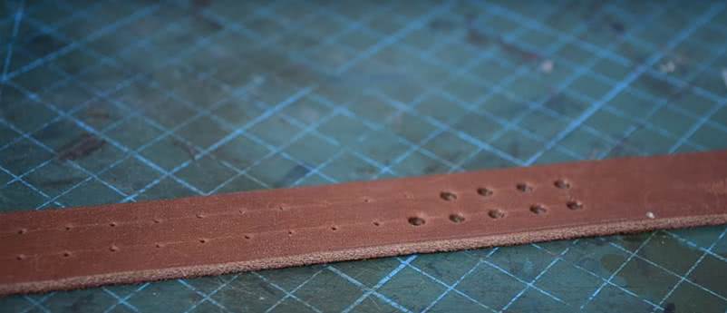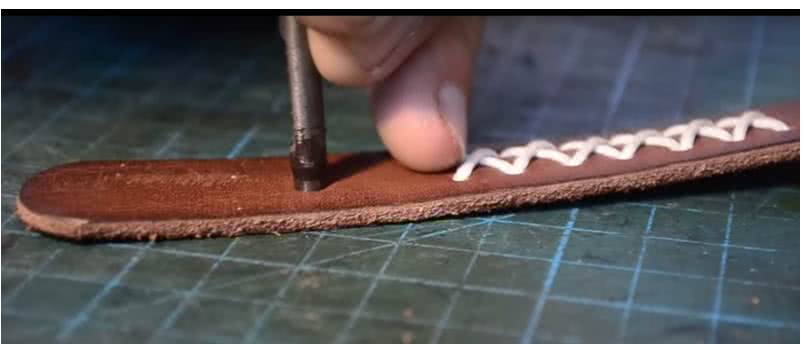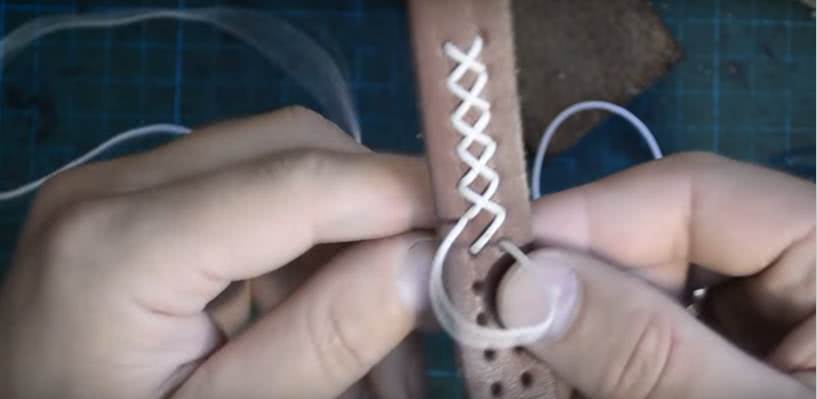 - Если кожа толстая и трудно протыкается иглой, сделать отверстия шилом по намеченной линии.