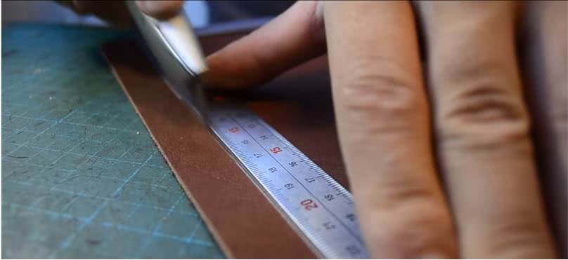 - Вырезать из кожи прямоугольник нужного размера. Отмеряя длину, следует учесть нахлёст для застёжки.