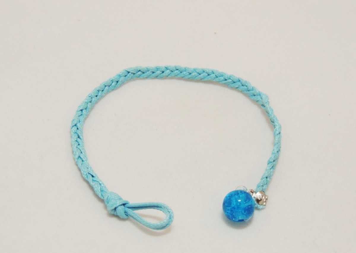 Такой браслет не составит труда сделать своими руками. Следует приготовит шнур, цвет которого лучше выбрать черный и темно-голубой. Шнур, окрашенный в синий цвет, по длине должен быть около 2 метров, черный – около полуметра. После обвязывания шнура синего оттенка вокруг черного необходимо начать завязывание узлов. Также заранее готовят 9 каменных или пластиковых бусин. Создание узелков каждый раз чередуется с нанизыванием бусины на шнур. Концы шнура должны содержать по 5 узелков, на кончиках такого браслета оставляется по 2 бусинки. На получившемся браслете легко фиксируются понравившиеся подвески.