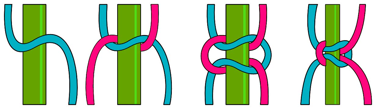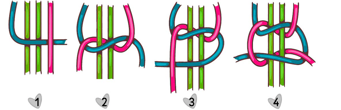 - Правый шнур (синий) проводим над основой, под левый (красный).