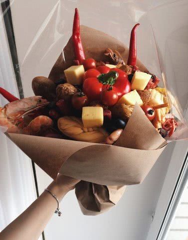Шикарно выглядит букет, составленный из копченых колбасок, острых овощей, сыра-косички, сушеной рыбы, багетов и шампанского, облаченный в декоративную бумагу с камуфляжным принтом.
