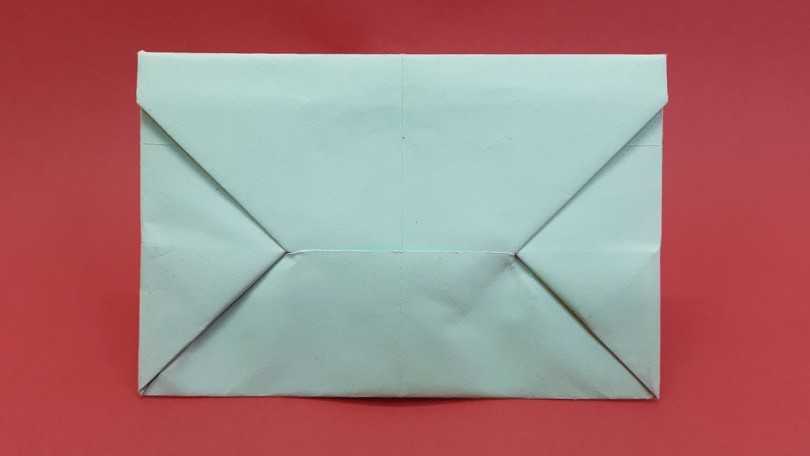 - Загните верхнюю часть конверта книзу, заправляя запечатывающий нахлест в получившийся кармашек, плотно прожмите места сгибов.