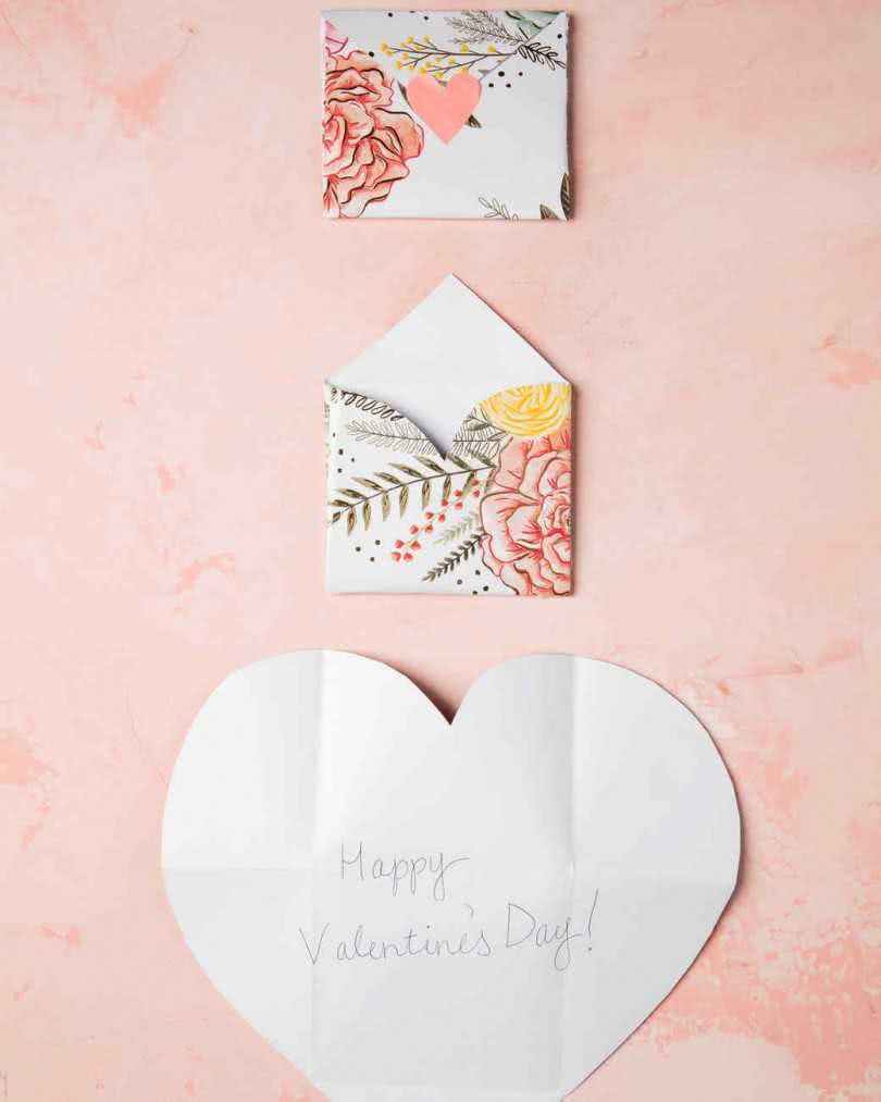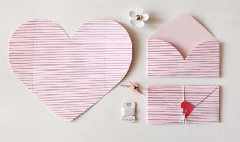 Ещё одна нехитрая технология, по которой можно из бумаги с лёгкостью сделать конверт своими руками. Конверт сердечком не обязательно проклеивать. Можно лишь хорошо прогладить изгибы, чтобы он держал форму и не открывался сам по себе. Получатель, раскрыв конвертик, увидит сердечко, что особенно актуально для рассылки поздравлений с Днём Святого Валентина или приглашений на свадьбу.