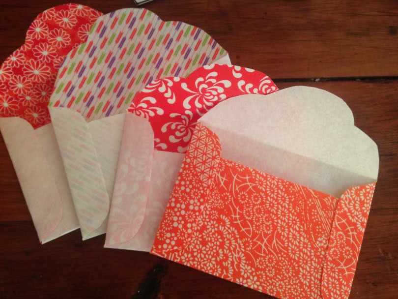 Если изделий предстоит сконструировать много, стоит использовать шаблон конверта. С такими вспомогательными мелочами можно существенно сэкономить время и создать внушительные объёмы. Подобная идея будет полезна для подготовительных мероприятий к свадьбе или корпоративу.