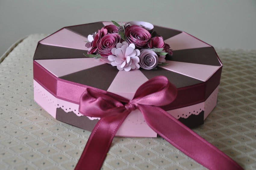 Если у вас есть время и желание, то можно своими руками склеить и собрать красивые коробочки для подарков, которые будут в единственном экземпляре. Например, такую (есть мастер-класс со схемами):