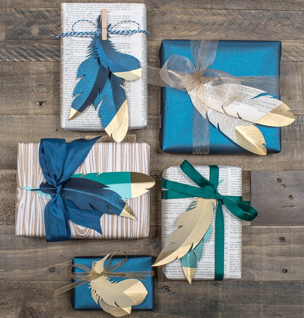 Чтобы придать упаковке подарка особый шик, достаточно дополнить декоративными перьями, их можно купить в специализированных магазинах. Такой элемент добавит упаковке легкости, тут главное не переборщить, иначе милая упаковка превратится в вульгарную.