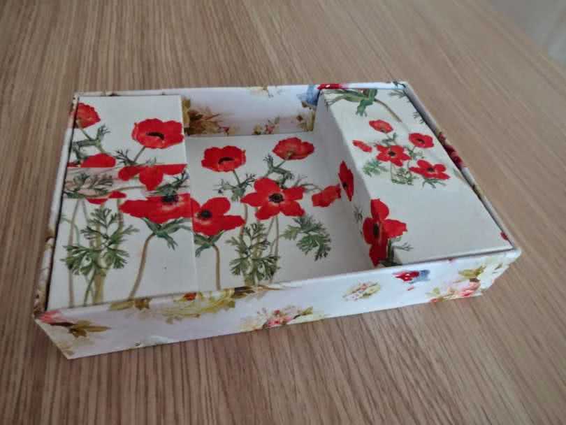 - Крышку обклеивают куском бумаги такой же формы, как и сама крышка, но, наоборот, большего размера, торчащие края подворачивают и закрепляют на внутренней стороне бортиков.