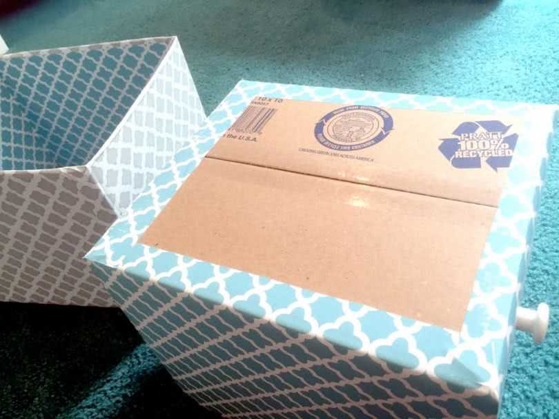 - Снимаем крышку, аккуратно обертываем коробку так, чтобы снизу можно было подвернуть сантиметр на дно коробки. Сверху подворачиваем оставшиеся края внутрь коробки и также обклеиваем.