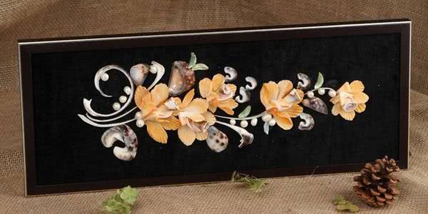 Приклейте на картонную основу все эти элементы декора, разместив их в виде сюжетного рисунка или просто геометрической фигуры. Картину вставьте в рамку.