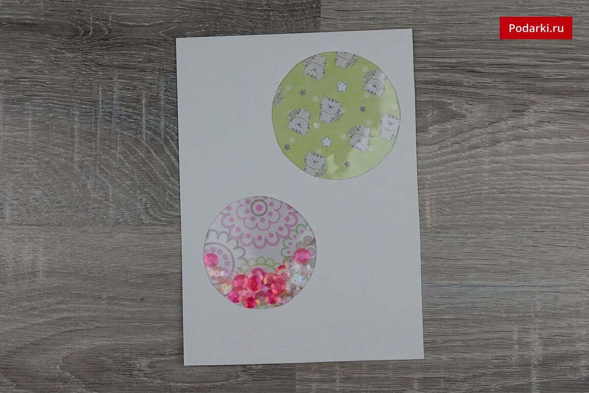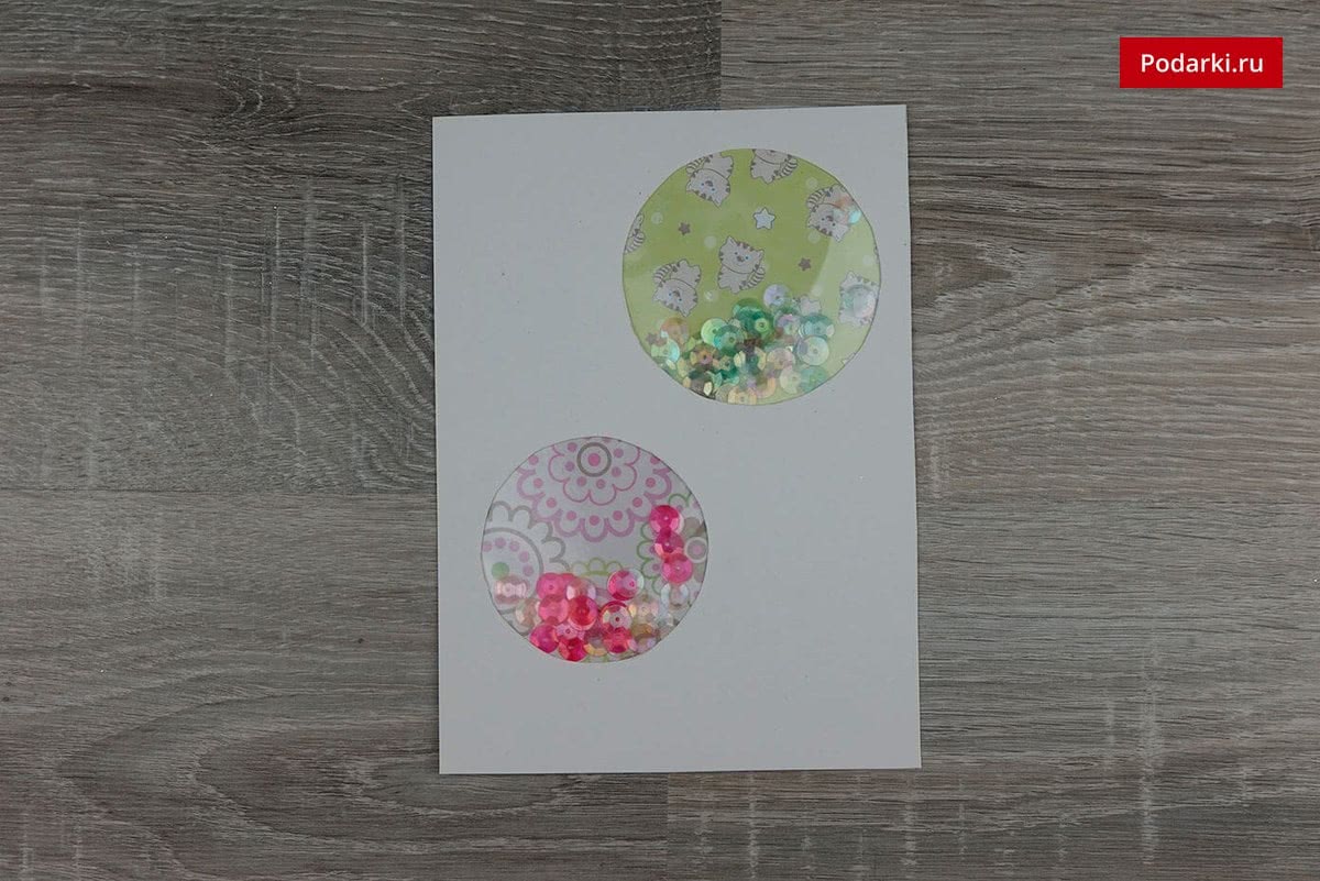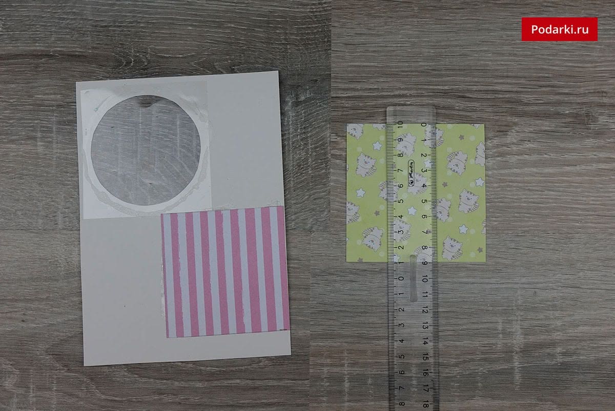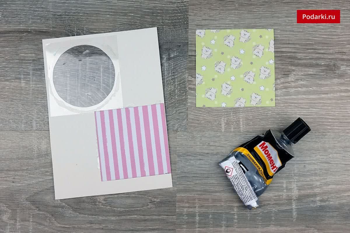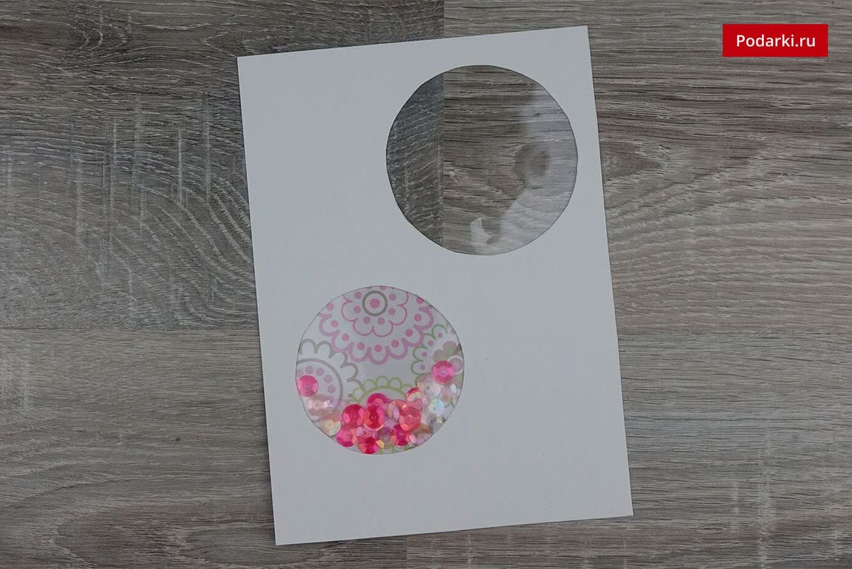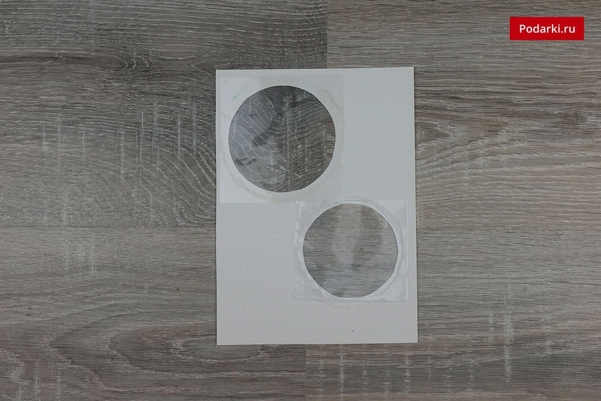 Приклеиваем последний вырезанный круг между двух окошек на заготовке.