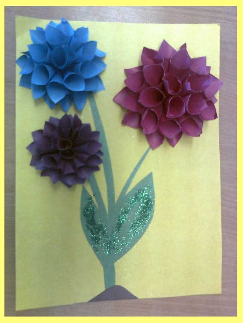 Основная работа проделана. Остается наполнить вазу цветами. Из зеленого цвета бумаги надо вырезать стебельки сразу с листьями, а из бумаги другого цвета несколько цветочков. Не гонитесь за диковинками, рисуйте то, что вы можете. Два бутона посадите на стебли, а один оставьте так.