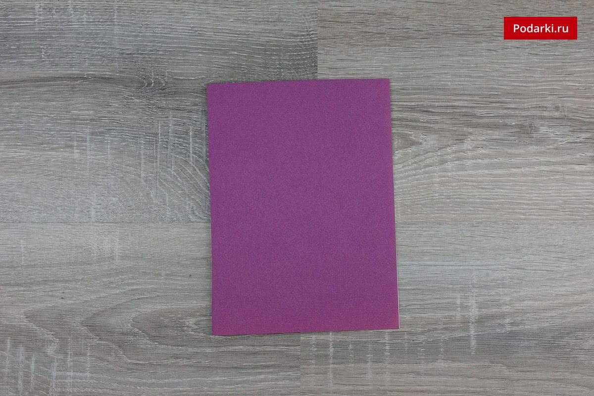Вырезаем из фиолетовой бумаги прямоугольник по размеру одной части основы. Наклеиваем его поверх открытки.