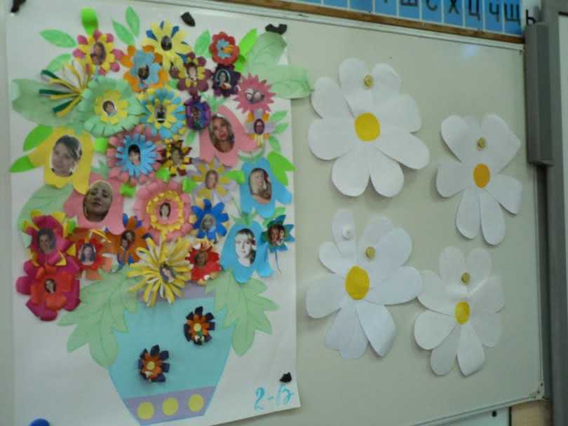Настало время заняться клумбой. Облагородим ее цветами. Из цветной бумаги разных оттенков сделаем заготовки разнообразных форм и размеров. Посадим их на стебли с листочками. Разместим готовые детали на поляне. Можно дополнить композицию бабочками, водрузить на цветок осу.