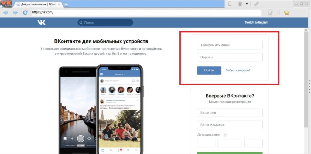 В приложении откроется окно браузера, где необходимо ввести логин и пароль от своего аккаунта вконтакте.