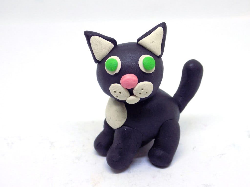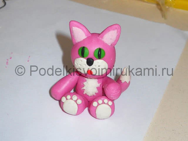 Наконец, формируем небольшие зрачки из кусочков черного пластилина. Наш котик из пластилина пошагово готов.