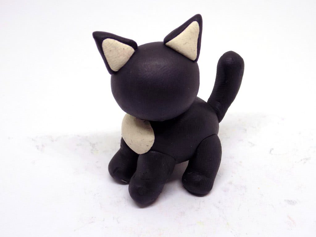 - И последняя обязательная часть фигурки- длинный черный хвост. Скатайте очень тонкую колбаску. Мягкий пластилин в таком виде не будет держать форму до тех пор, пока вы не вставите в середину тонкую проволоку. Прикрепите хвост.