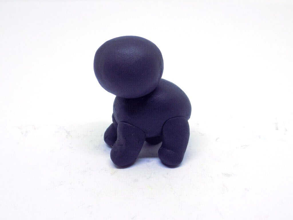 Присоединяем к телу голову (стараясь её не деформировать) и задние лапы (шарики расплющиваем на концах, чтобы сформировалась ступня, немного вытягиваем и прикрепляем).