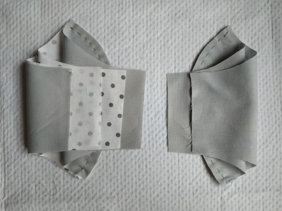 - Теперь можно убрать булавки и оставить только ткань, которую необходимо сложить попарно лицевой частью внутрь. На всех деталях делаем средний шов, размер припуска составляет 1см. После этого обрежьте припуска, чтобы осталось примерно 0,5 см и прогладьте все.