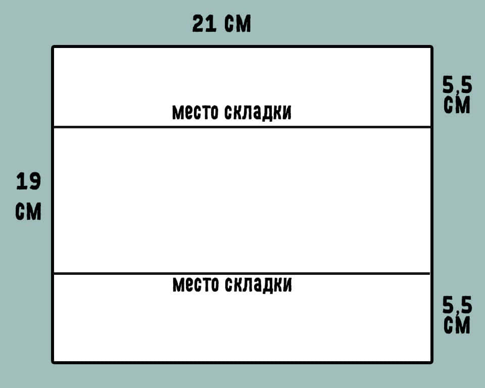 1. Вырежьте из бумаги прямоугольный шаблон 21×19 см. Заранее отметьте на нем места будущих складок, отступив по 5,5 см сверху и снизу.