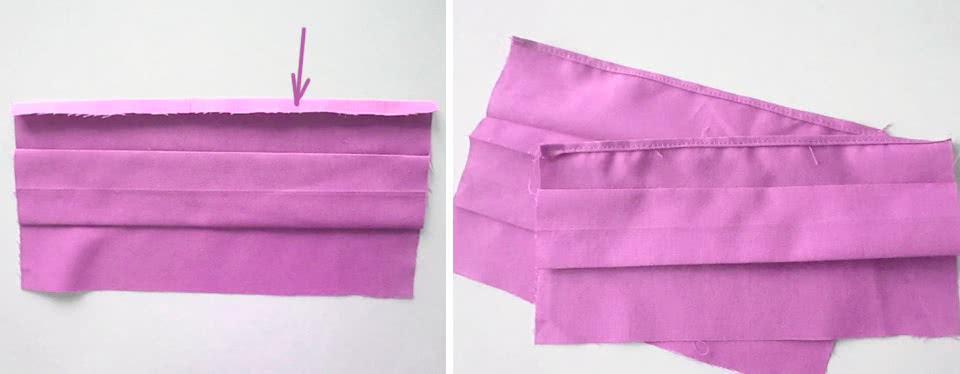 4. Возьмитесь за ткань с обеих сторон там, где у вас верхняя метка, и сдвиньте ее вниз, соединяя метку со сгибом и формируя складку.