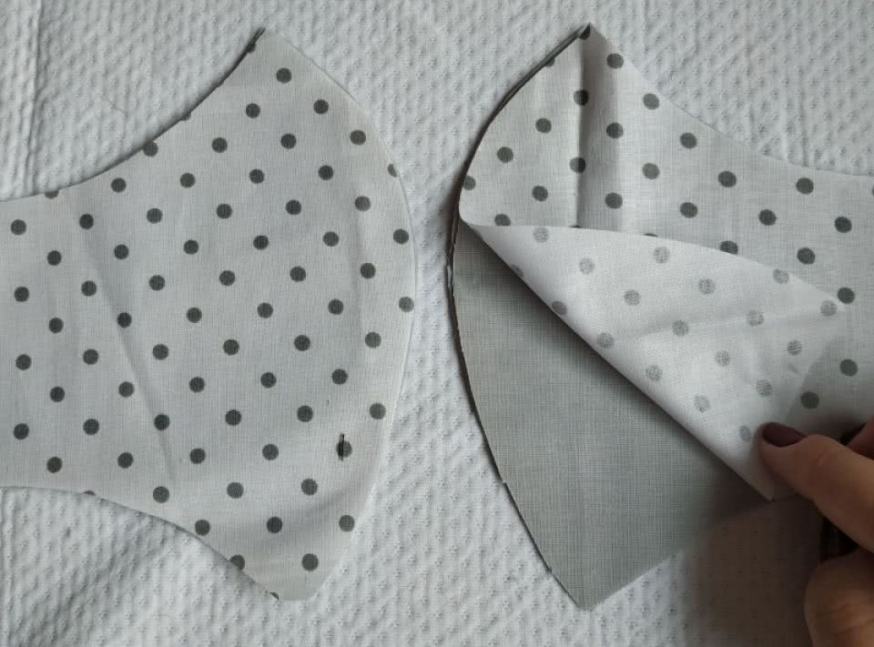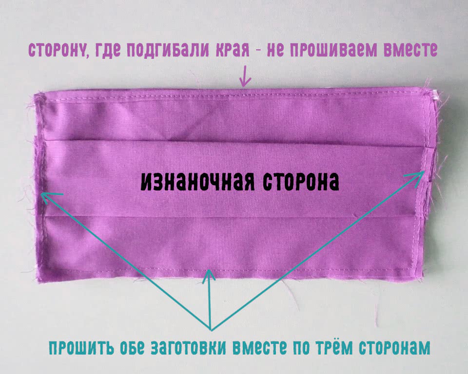 Шаг 4. Выворачиваем. Утюжим. Складываем детали верха и изнанки лицом к лицу. Для уменьшения толщины слоя лучше развернуть швы в разные стороны. Сшиваем верх и низ маски, оставляя открытыми боковые стороны.