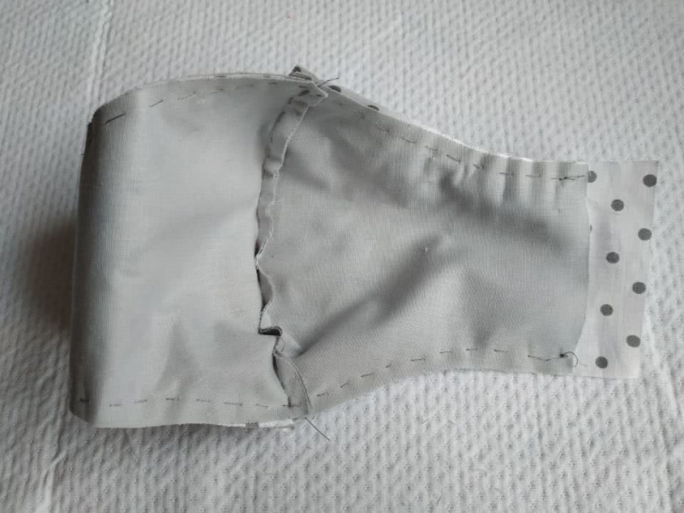 - Все боковые детали маски нужно обработать швом зигзаг, затем вывернуть наизнанку и прогладить. Также сделайте строчки по бокам отступая 1 см от сгибов, это будут кулиски.