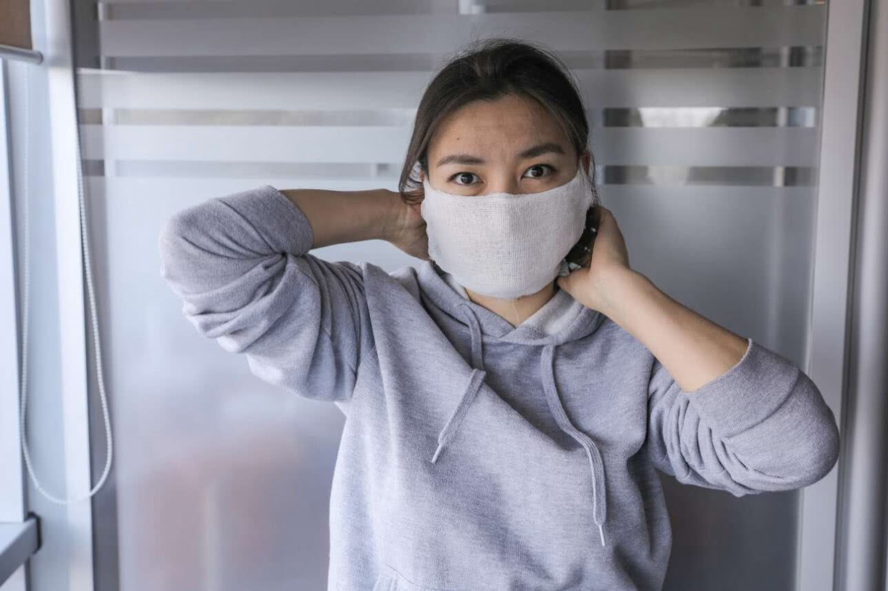 Прикройте повязкой рот и нос, зацепив резинки за уши. Ее эффективность продержится не более получаса, после чего ее нужно обязательно утилизировать.
