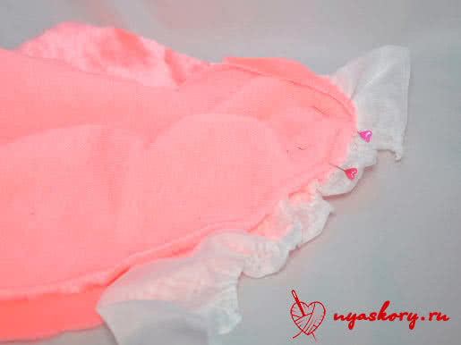 Сейчас вам надо вложить оборочку внутрь подушки, как показано ниже, и вколоть.