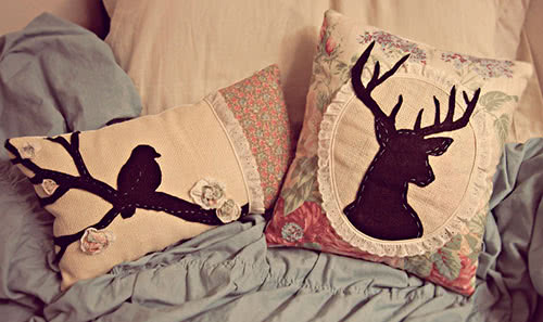 Аппликации можно изготовить самостоятельно из кусочков флисовой ткани, меха, войлока, фетра, кожи, лент. Из выбранного материала выкраивают нужные формы и пришивают к готовой подушке.