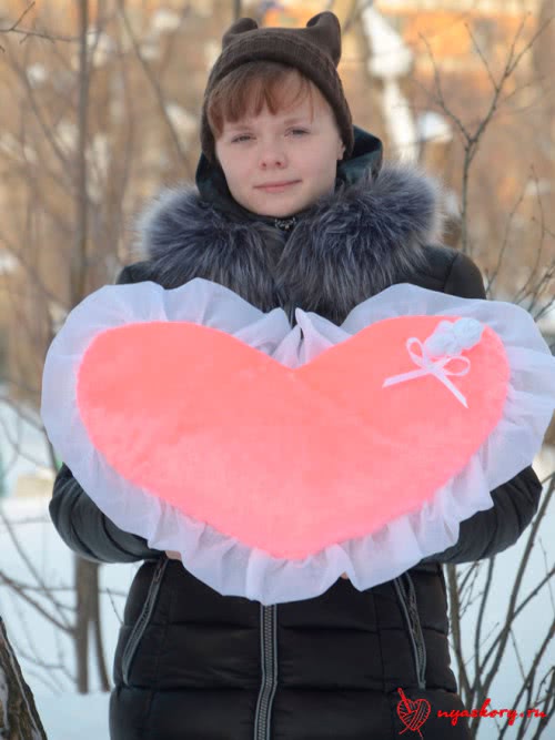 О каком же подарке я говорю? Будем шить красивую розовую подушку в форме сердца с оборками из вуали.