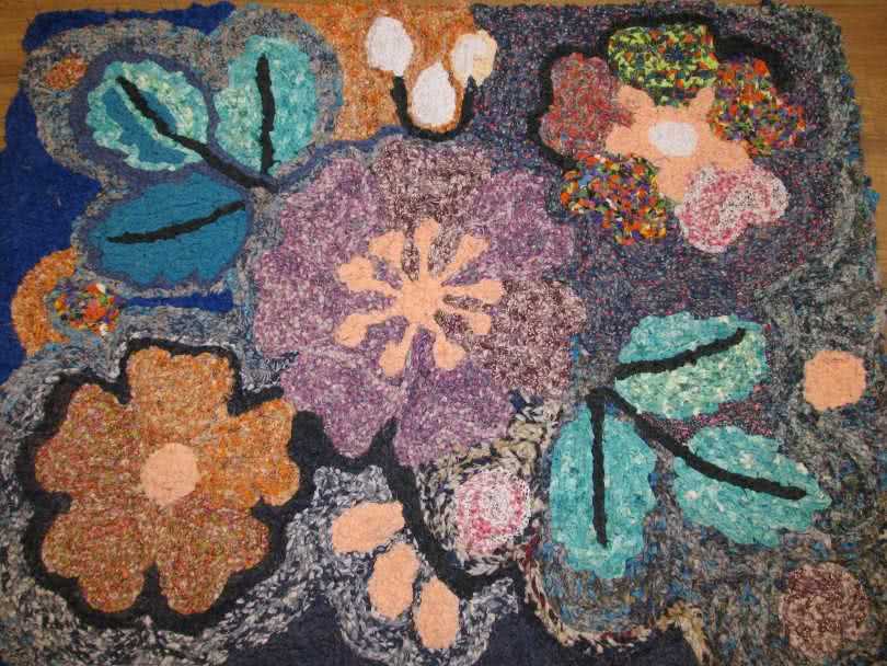 Из старых пледов и покрывал строгой однотонной расцветки получится интересный коврик в виде цветов или полянки. Если ткань достаточно толстая и плотная, можно даже обойтись без наполнителя или использовать его совсем немного.