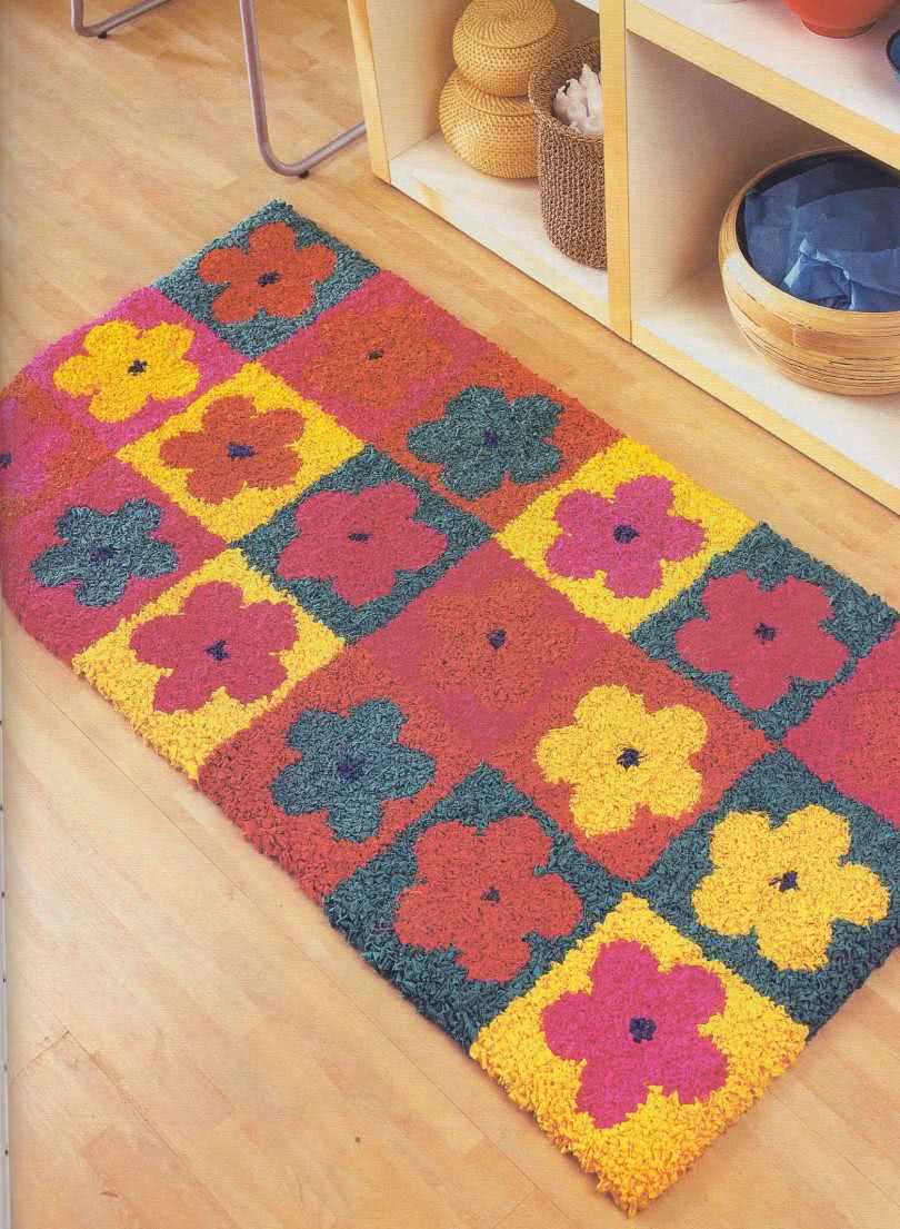 Для создания таких ковриков любого цвета приобретают готовый набор в магазине для шитья, вязания. Нити крепят на канву крючком, образуя объемный узор. Декоративное изделие используют как украшение.