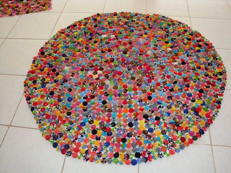 Небольшой круглый или овальный половик с необычной чешуйчатой фактурой очень уместен в спальне, в прихожей, в ванной. Рассмотрим, как сшить бабушкин коврик из остатков ткани пошагово.
