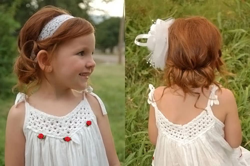 Малышке, у которой волосы доросли до плеч, можно сделать эту красивую быструю прическу. Укладка подойдет и на каждый день, и для праздничного мероприятия.
