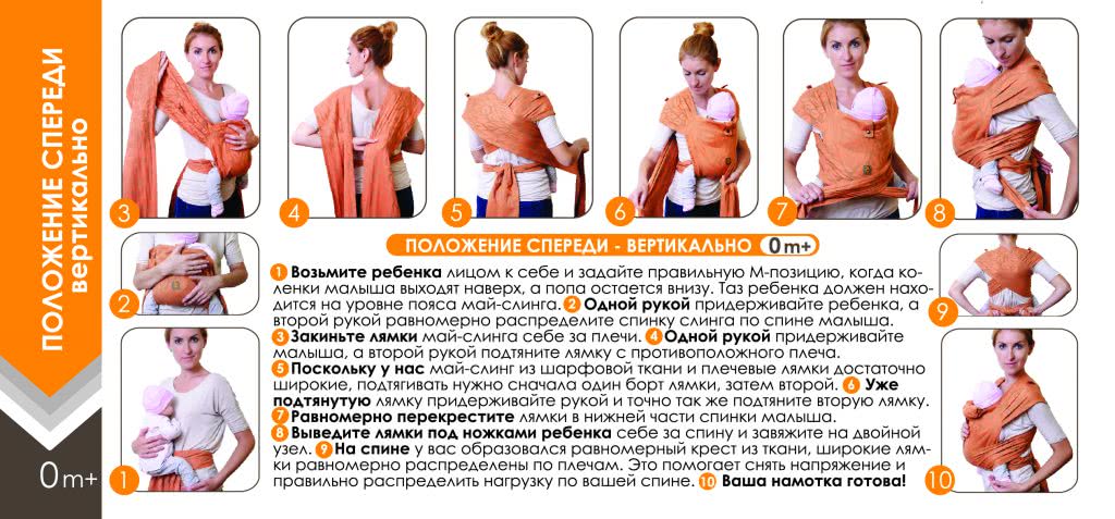 Какой вариант выбрать, как завязать слинг — это вы можете решить, исходя из конкретной своей ситуации. Быть может, вам захочется иметь слинг шарф для новорожденного и слинг шарф для годовалого ребенка. При этом, возможно, вам понадобится и длинный, и короткий, и средний слинг.