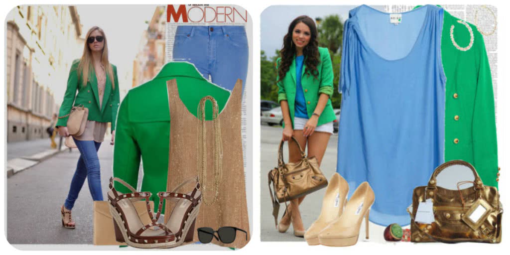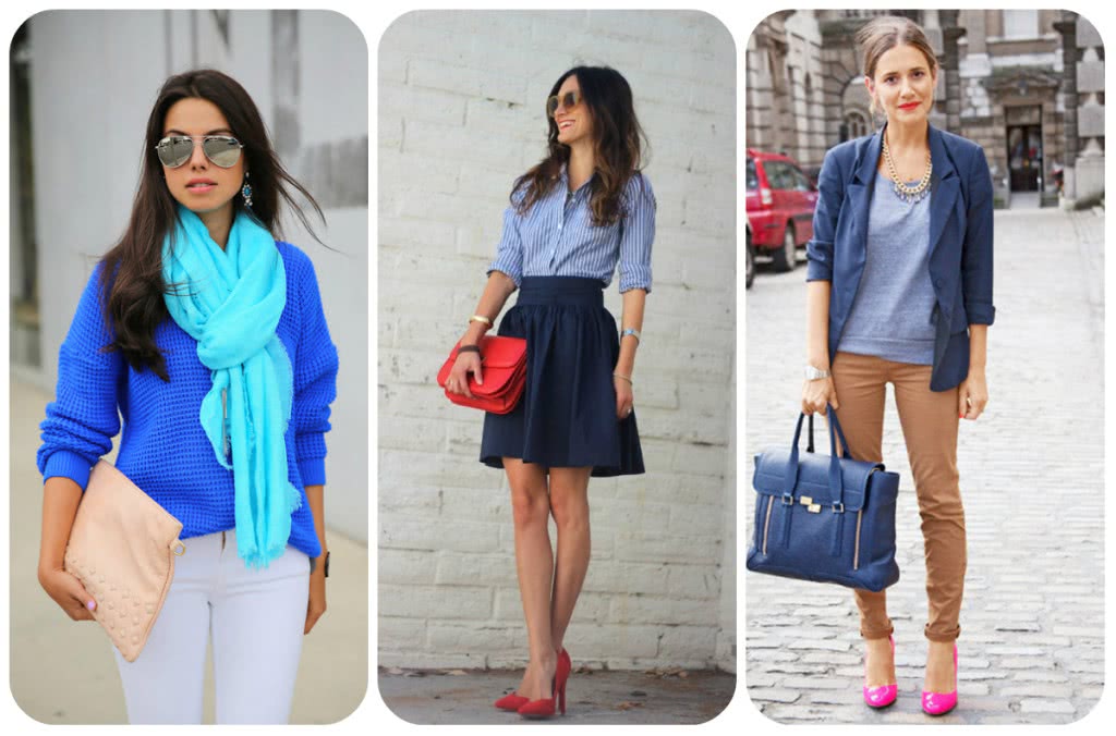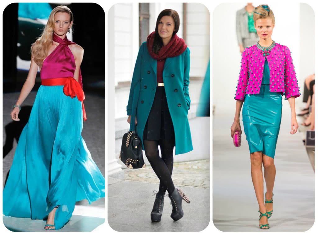 Аналогичное сочетание подходит для представительниц любой внешности: для блондинок с голубыми глазами и ярких брюнеток со светлой кожей. Для голубого оптимальным будет сочетание с зеленым и желто-зеленым, а также с синим и сине-фиолетовым. Это сочетание позволит подобрать образ к любому мероприятию и выглядеть всегда на высоте.