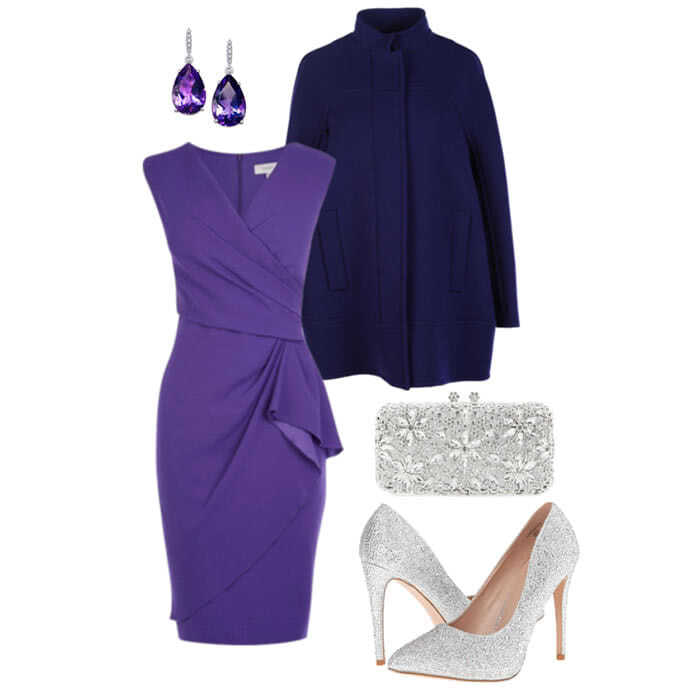 Интересный женственный и романтичный образ получится, если сочетать более нежные, лёгкие оттенки с насыщенными. Синее лаконичное платье-футляр выглядит менее строго в сочетании с мягким пальто пурпурного цвета. Клатч виноградного оттенка перекликается с тоном пальто, а туфли и аксессуары с бантиками придают ансамблю игривое настроение.