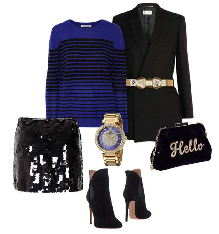На встречу с друзьями или вечеринку составьте яркий комплект из синего джемпера и чёрной юбки в пайетках. Джемпер или блуза могут быть однотонными, но могут быть выполнены и с простым классическим принтом. Например, в полоску, клетку или горох. На плечи можно набросить чёрный жакет или кардиган. Обувь к такому комплекту должна подходить стилистически. Броские украшения отлично поддержат яркий образ.