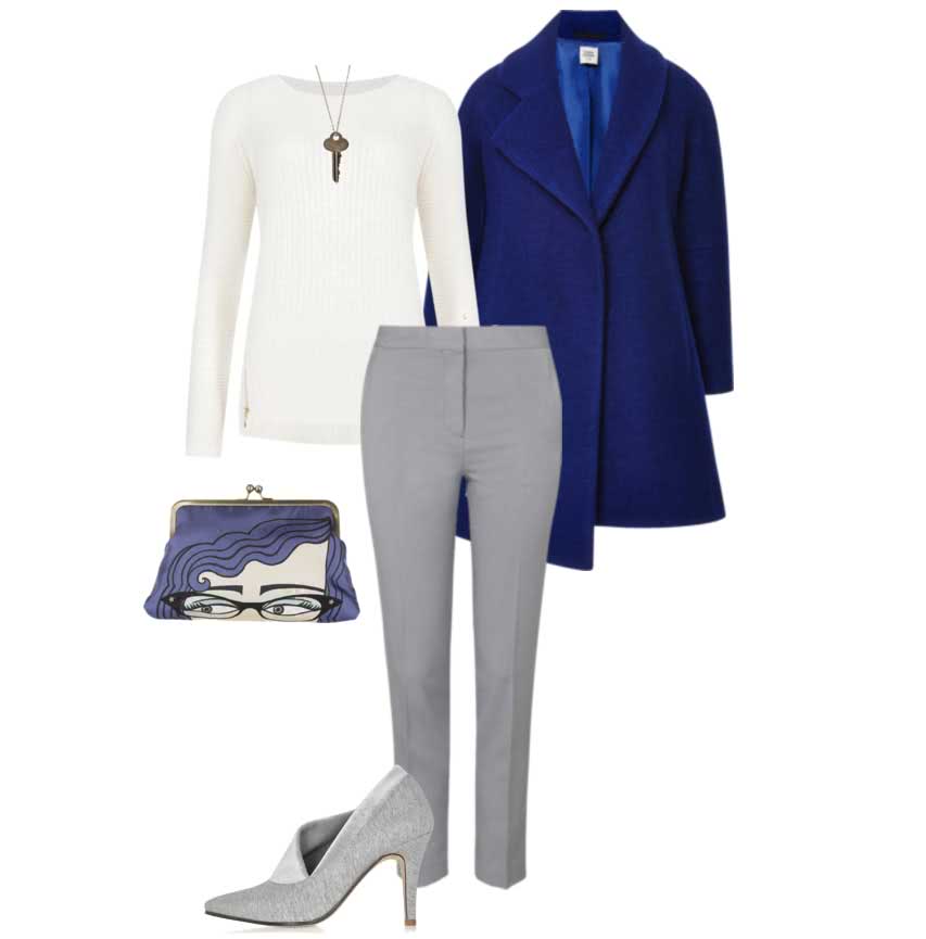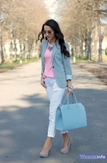 Для строгого образа из белой блузы и светло-синих брюк фиолетовый жакет станет акцентом. Туфли-лодочки подбираем в цвет брюк, тем самым визуально удлиняя ножки. Белая сумка делает образ ещё более контрастным. Украшение серебристого цвета поддерживает такую же фурнитуру на сумке. В целом, комплект яркий и, в то же время, достаточно спокойный.