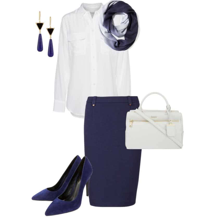 Сочетание белого с тёмно-синим создаёт строгий, но при этом, нарядный лук. Такой комплект будет особенно хорош для делового наряда. Он настроит на рабочую волну и не будет отвлекать. Сочетание этих цветов универсально и подойдёт как для комплекта на каждый день, так и для официального или торжественного мероприятия.