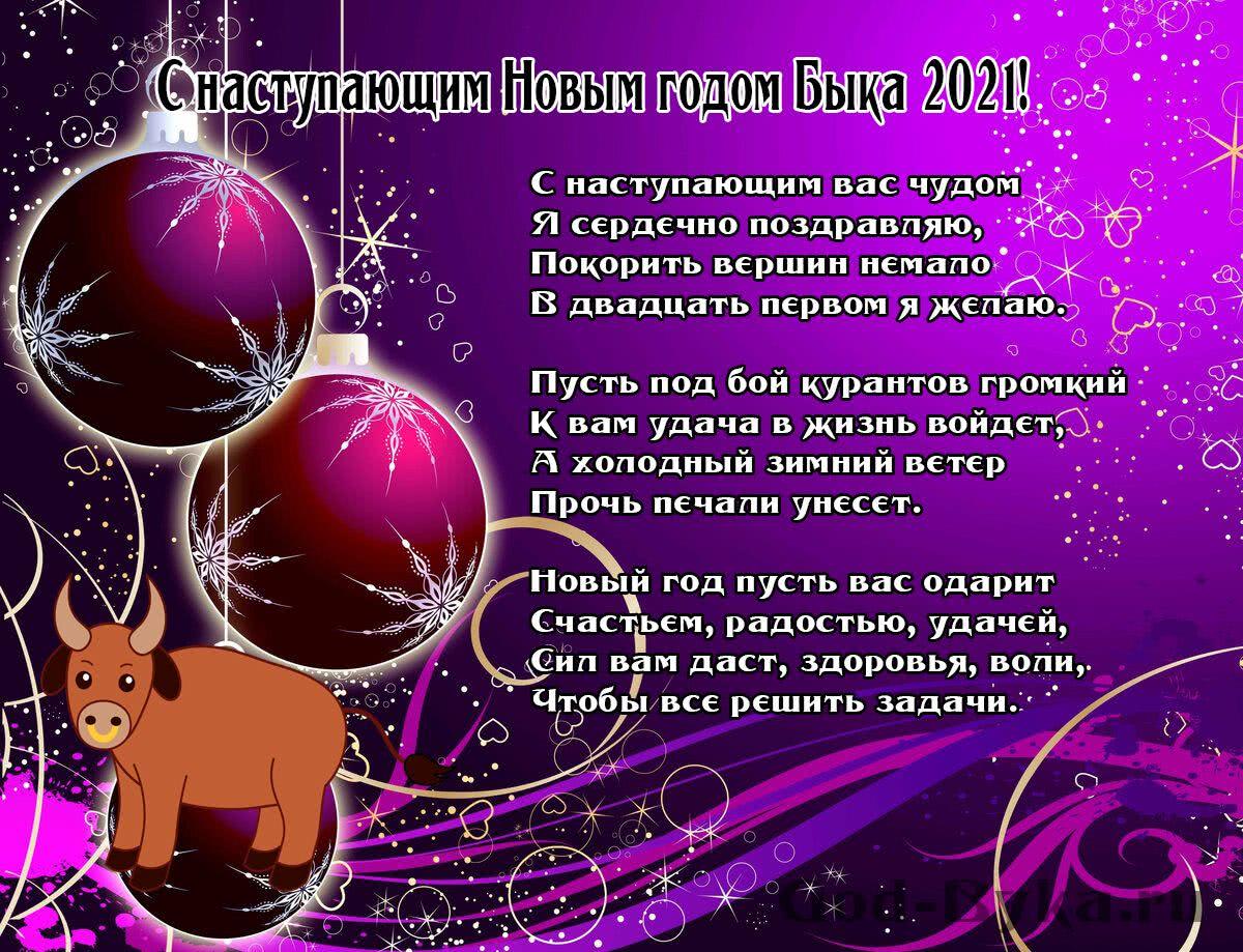 Двери в Новый год открыты, Бьёт Бычок об пол копытом! Стукнет раз, потом второй – Будет литься смех рекой! Счастье людям предвещая, Всех добром обогащая, Бык нас в этот Новый год, Непременно сбережёт!