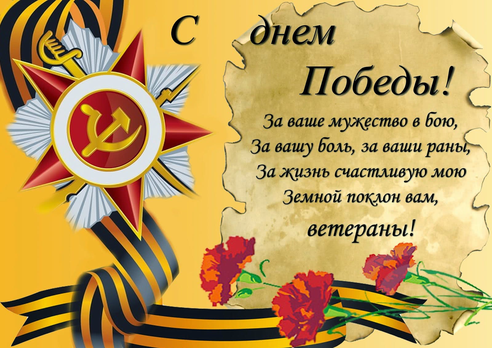 Поздравляем с Днем Победы! Любуемся весною! Гордимся героизмом и отвагой всей страною, Желаем доброго здоровья и долгих жизни лет, Пусть в вашей жизни будет ещё много радостных побед!