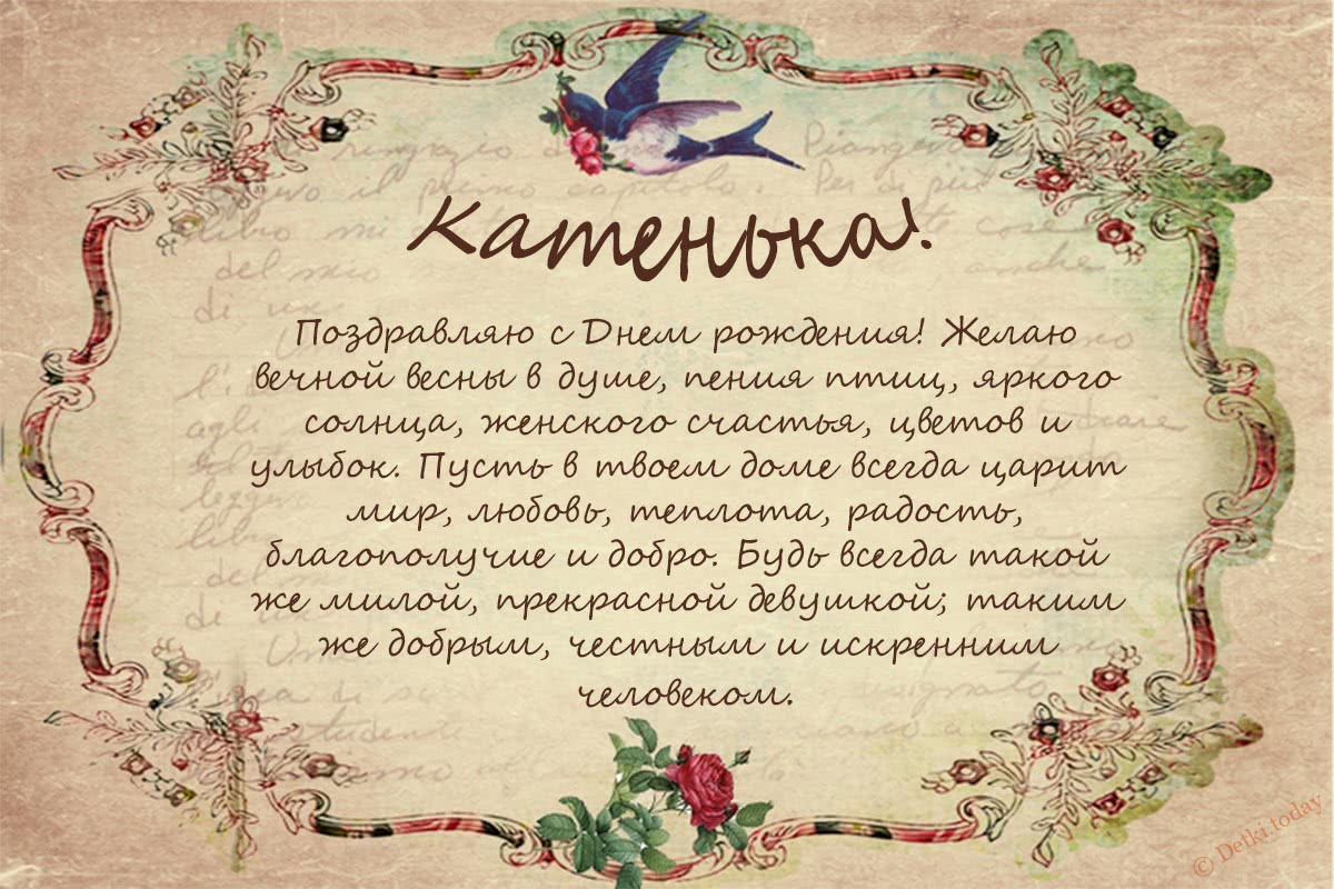 Праздник День рождения для Катюши особенный. Она ждет, чтобы ее отметили. Искренние поздравления, шикарные цветы, дорогие и нужные подарки – то, чего ей хочется больше всего. Если вы не хотите разочаровать девушку, спешите поздравить ее: с самого утра позвоните ей или пришлите в Интернете красивую именную открытку. Катерина оценит и оригинальную картинку, и поздравительный текст на ней.