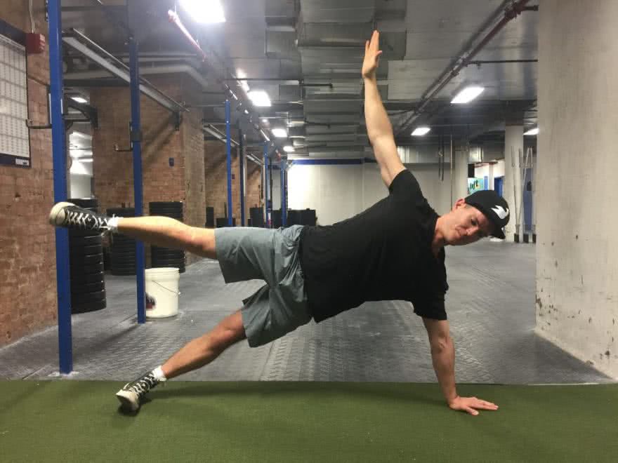 Достигнув уровня удержания планки, переходить следует на усовершенствованный вариант исполнения — с поднятой конечностью. Постепенно утяжелять нагрузку с мячом, гантелей в качестве подвеса. В ходе упражнения рука вытягивается параллельно полу.