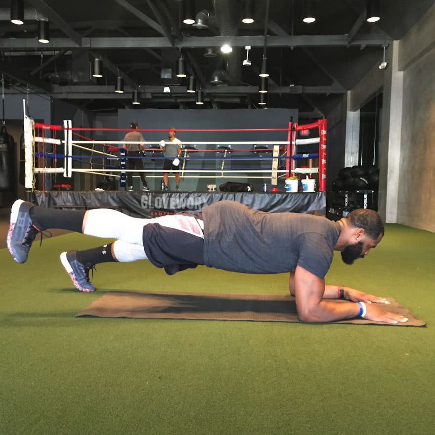 - Планка в движении. Нужно сделать упор на ладони, затем на счет опускаться на локти и снова возвращаться в исходное положение.