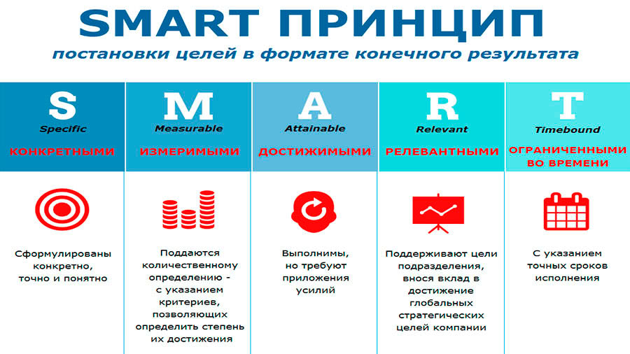 На первый план требуется вынести несколько категорий, в которых желательно получить результат в ближайшее время. В них необходимо обозначить цели, к которым нужно предъявить 3 требования: